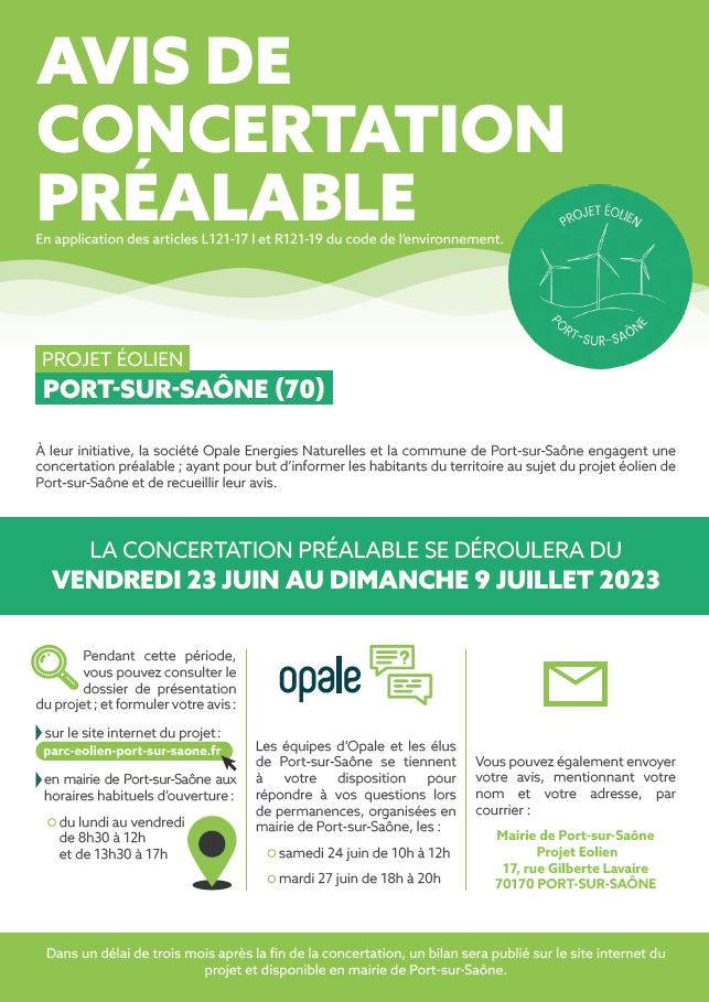Conformément au Décret n° 2023-1245 du 22 décembre 2023 prévu à l’article L. 211-9 du code de l’énergie, un comité de projet a été organisé par la commune de Port-sur-Saône et Opale. Les communes, dont une partie du territoire est située à une distance inférieure à 6km du projet, ont été invitées ainsi que la Communauté de Communes Terres de Saône.